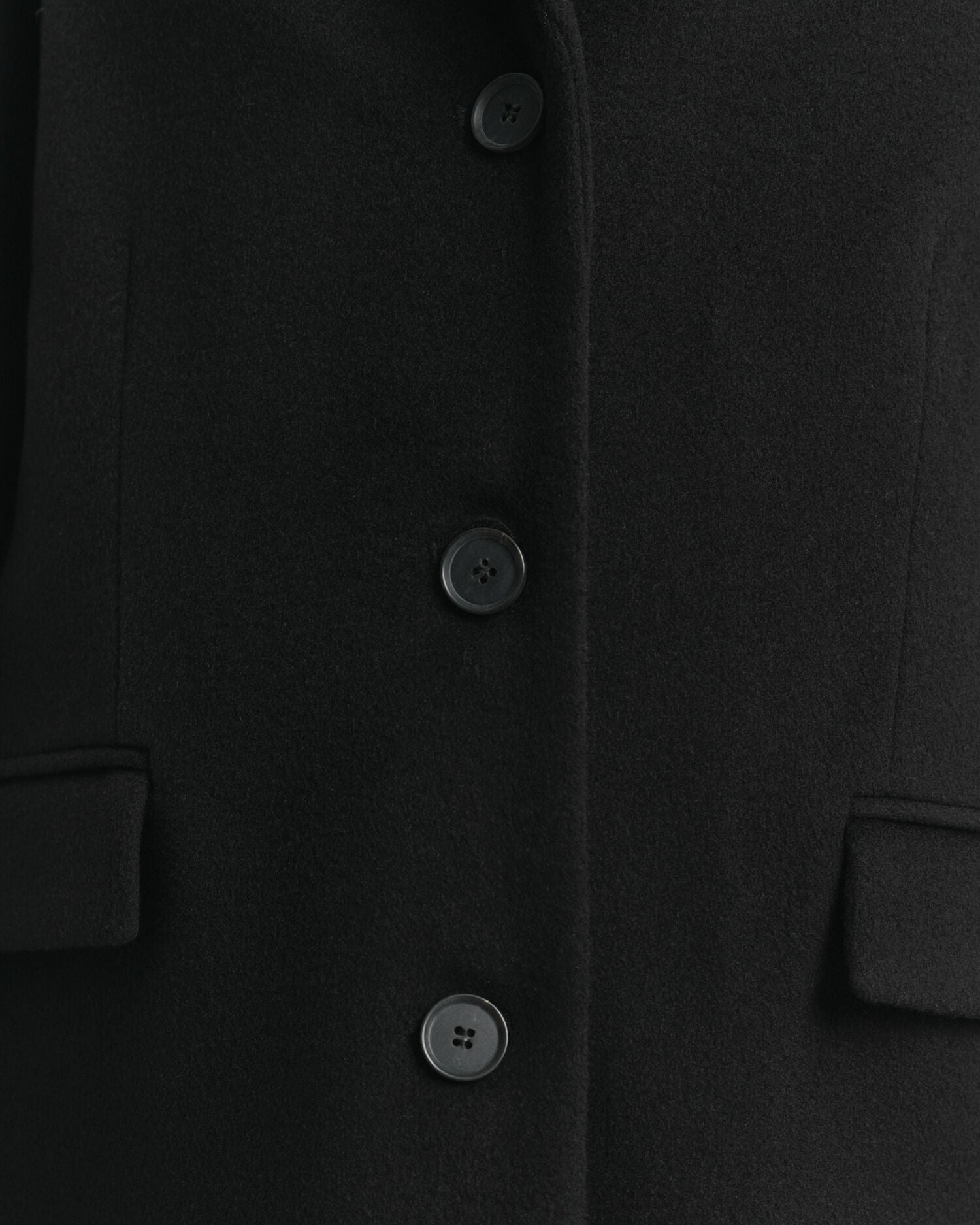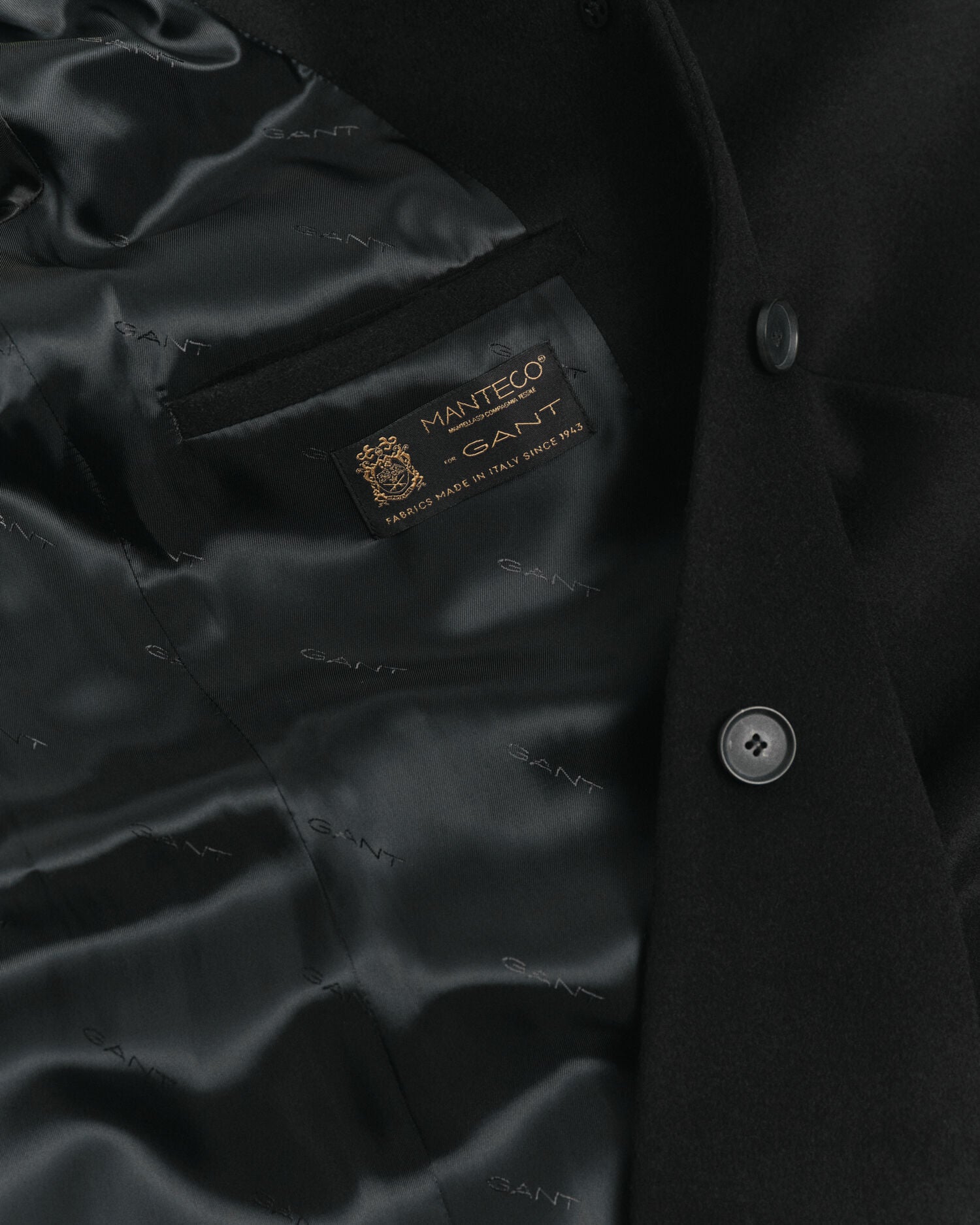Every wardrobe needs a classic, tailored fit coat. Crafted in a premium Italian wool blend with a touch of cashmere, this coat has a supremely soft hand-feel. Single-breasted, this elecoat has a regular fit that finishes just below the knee. The lining is made from a certified viscose blend and features a branded jacquard pattern. This coat is designed with a notch collar and lapels, a high back slit, flap pockets, an interior pocket, and a 3-button closure at the front with imitation horn buttons.