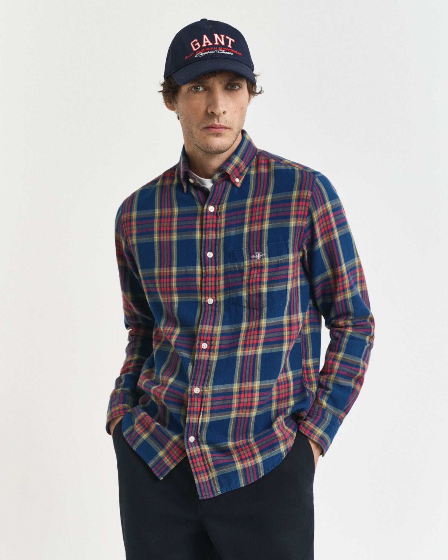Crafted from a classic twill fabrication, this shirt is designed with a yarn-dyed indigo check pattern and a regular fit. The design features a classic button-down collar, adjustable cuffs, a curved hem, recycled polyester buttons and a shield graphic embroidered at the chest pocket.