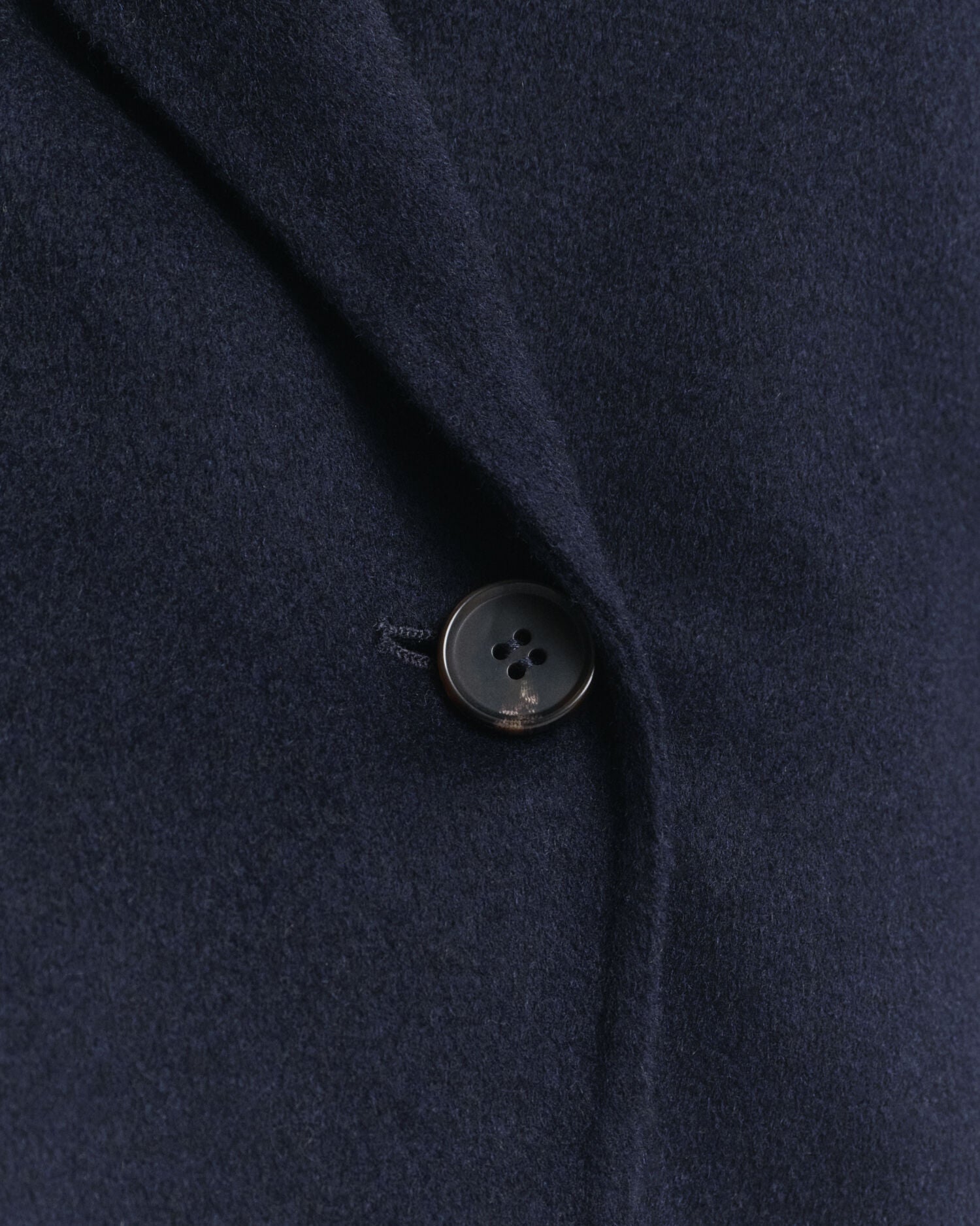 This jacket is made from a double-layered wool blend in a hand-stitched construction, giving it a super soft hand-feel and premium look. Designed with dropped shoulders, this jacket has a regular fit with a double-breasted front and hip length. Details include a notch collar and lapels, a high back slit, side seam pockets, branded imitation horn buttons and a removable belt at the waist.