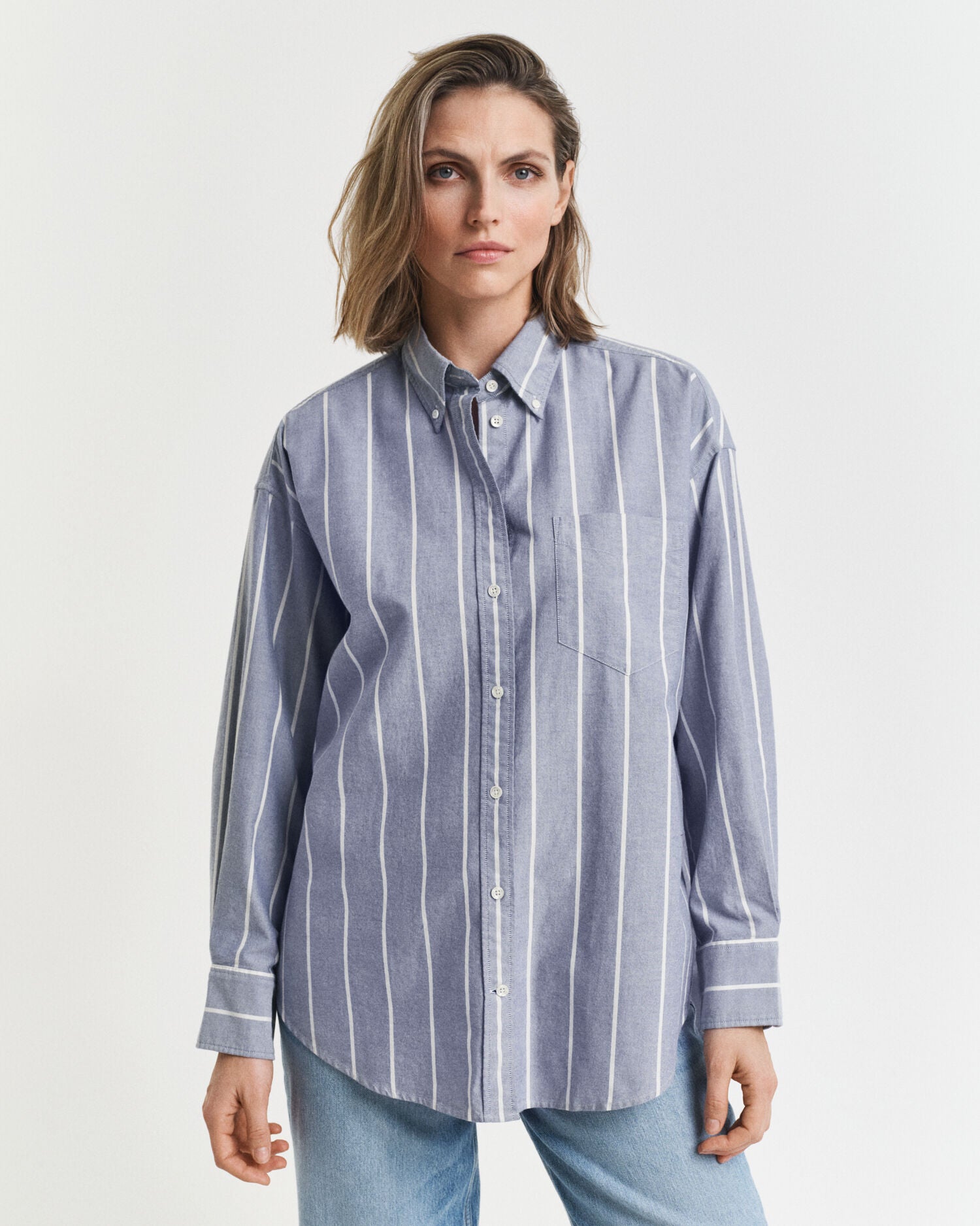 Crafted from cotton, this oversized shirt is designed with a classic all-over striped print pattern. Featuring a button-down collar, the design is detailed with a chest pocket, adjustable sleeve cuffs, a curved hem and our signature locker loop with a box pleat at the back. To top off the design, the shirt is complete with a logo embroidery at the sleeve placket. This garment is intended for an oversized fit. For a closer fit, we recommend sizing down.