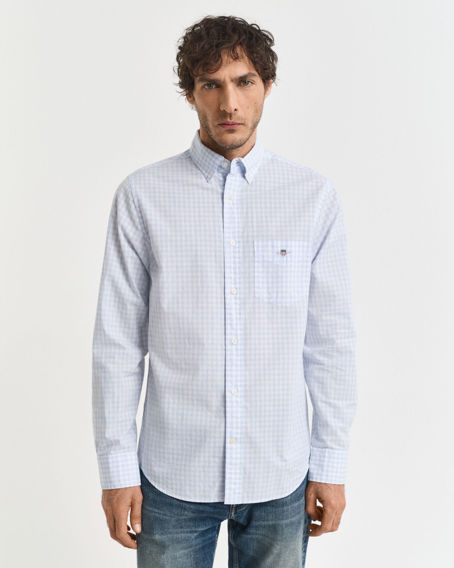 Add a timeless style to your shirt collection with our Gingham Poplin Shirt. Cut in a comfortable, regular fit and detailed with our shield graphic at the chest pocket, this shirt is sure to elevate any business-casual look.