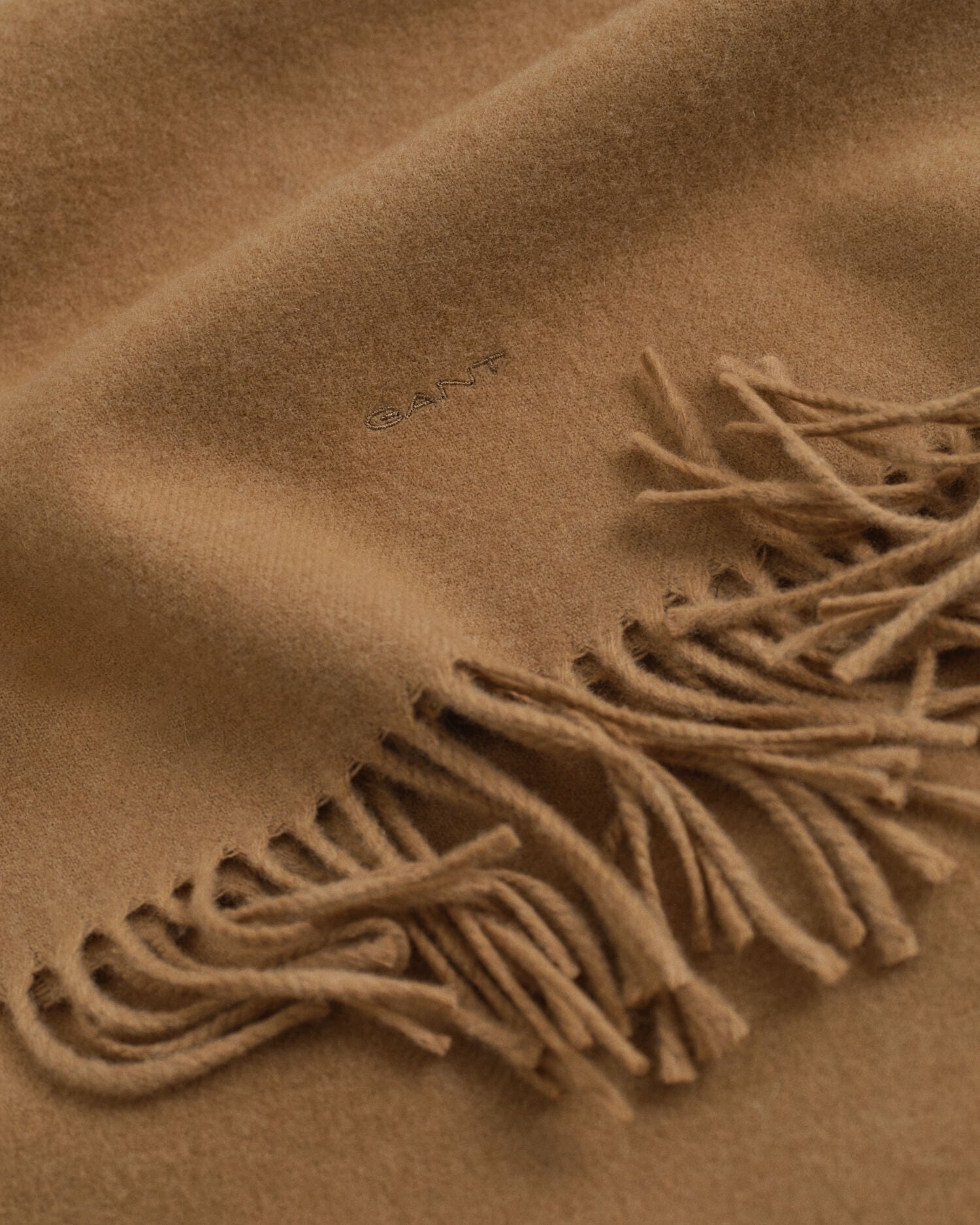 Crafted out of 100% wool, this unisex scarf features fringed edges and a tonal logo embroidered at the bottom.
