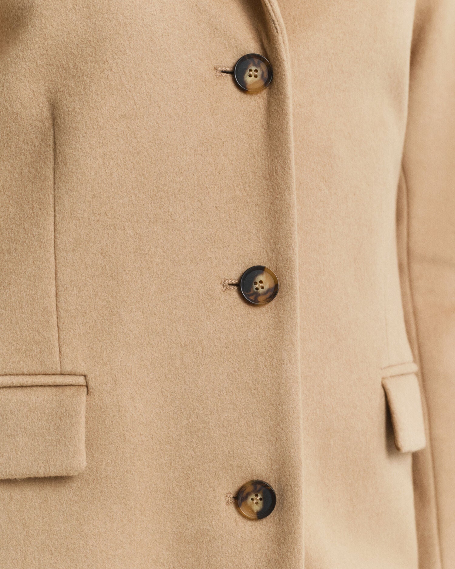 Every wardrobe needs a classic, tailored fit coat. Crafted in a premium Italian wool blend with a touch of cashmere, this coat has a supremely soft hand-feel. Single-breasted, this elecoat has a regular fit that finishes just below the knee. The lining is made from a certified viscose blend and features a branded jacquard pattern. This coat is designed with a notch collar and lapels, a high back slit, flap pockets, an interior pocket, and a 3-button closure at the front with imitation horn buttons.