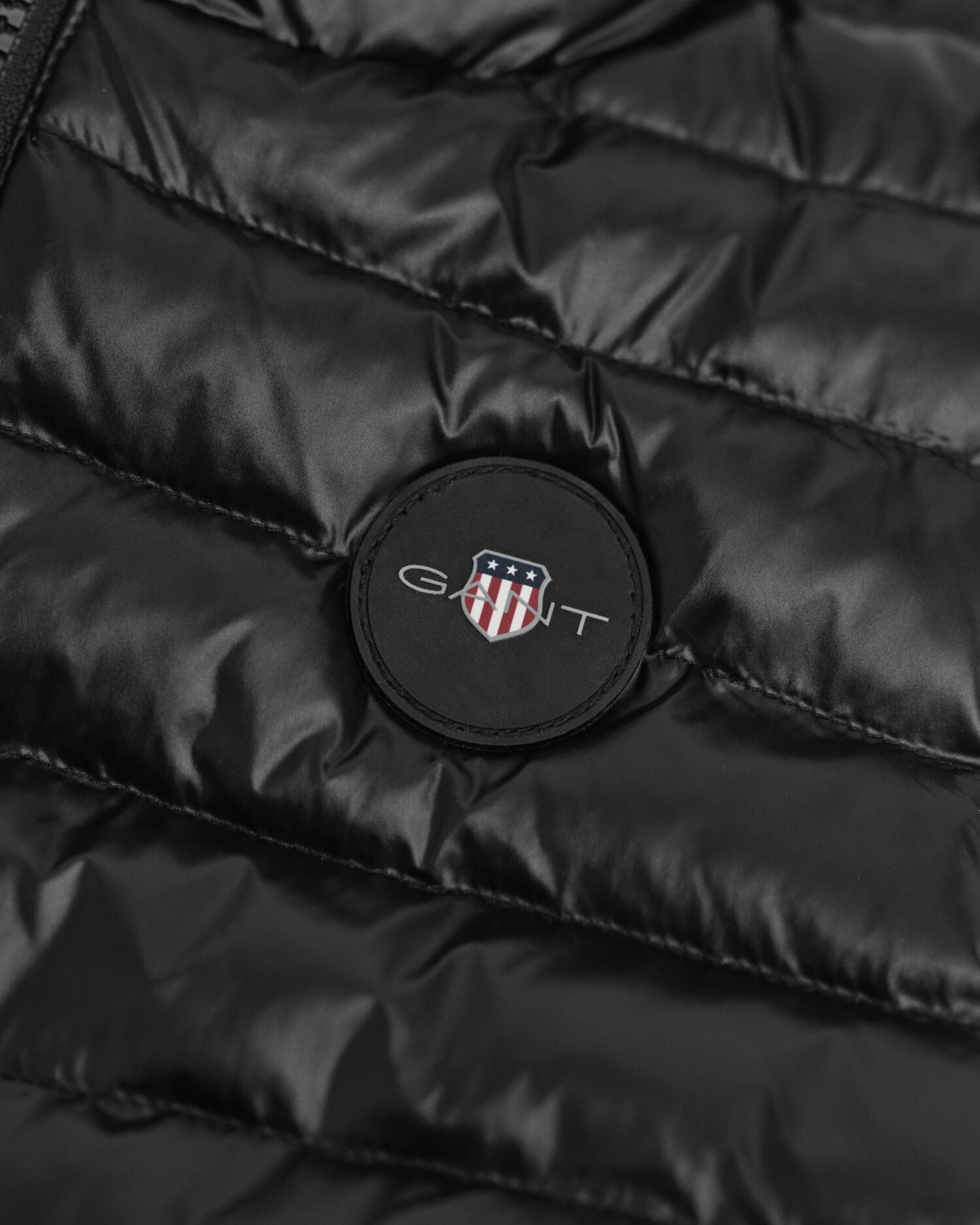 Designed for a sporty look with a shiny effect, this lightweight padded vest for kids adds warmth without the bulk, courtesy of its certified down padding. Made for a regular, unisex fit, it features two buttoned pockets, soft elastic at the hem and a zip closure with a protective chin guard. This water-repellent vest is detailed with a circular rubber logo attached at the chest. This vest features a Durable Water Repellent (DWR) treatment which will help to shed water in light weather conditions. If you're unexpectedly caught in a downpour, please follow the care instructions closely to restore the performance and prolong the life of this garment.
