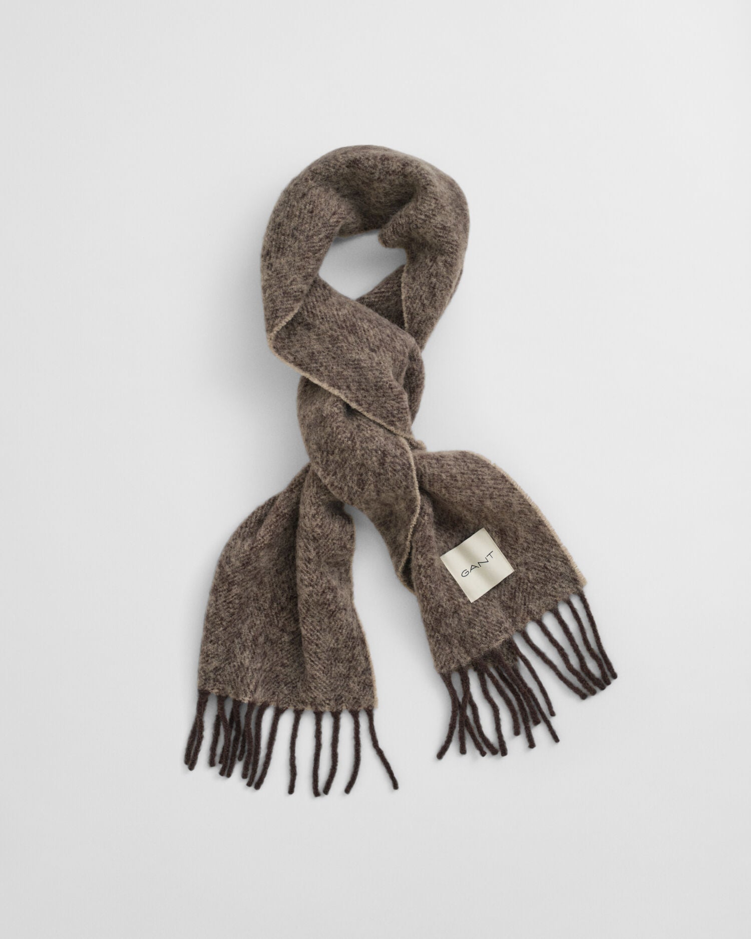 Crafted in a fluffy mohair and alpaca wool blend, this scarf features a distinct herringbone pattern. A cozy winter essential, it is detailed with fringed edges and a label at the bottom corner.