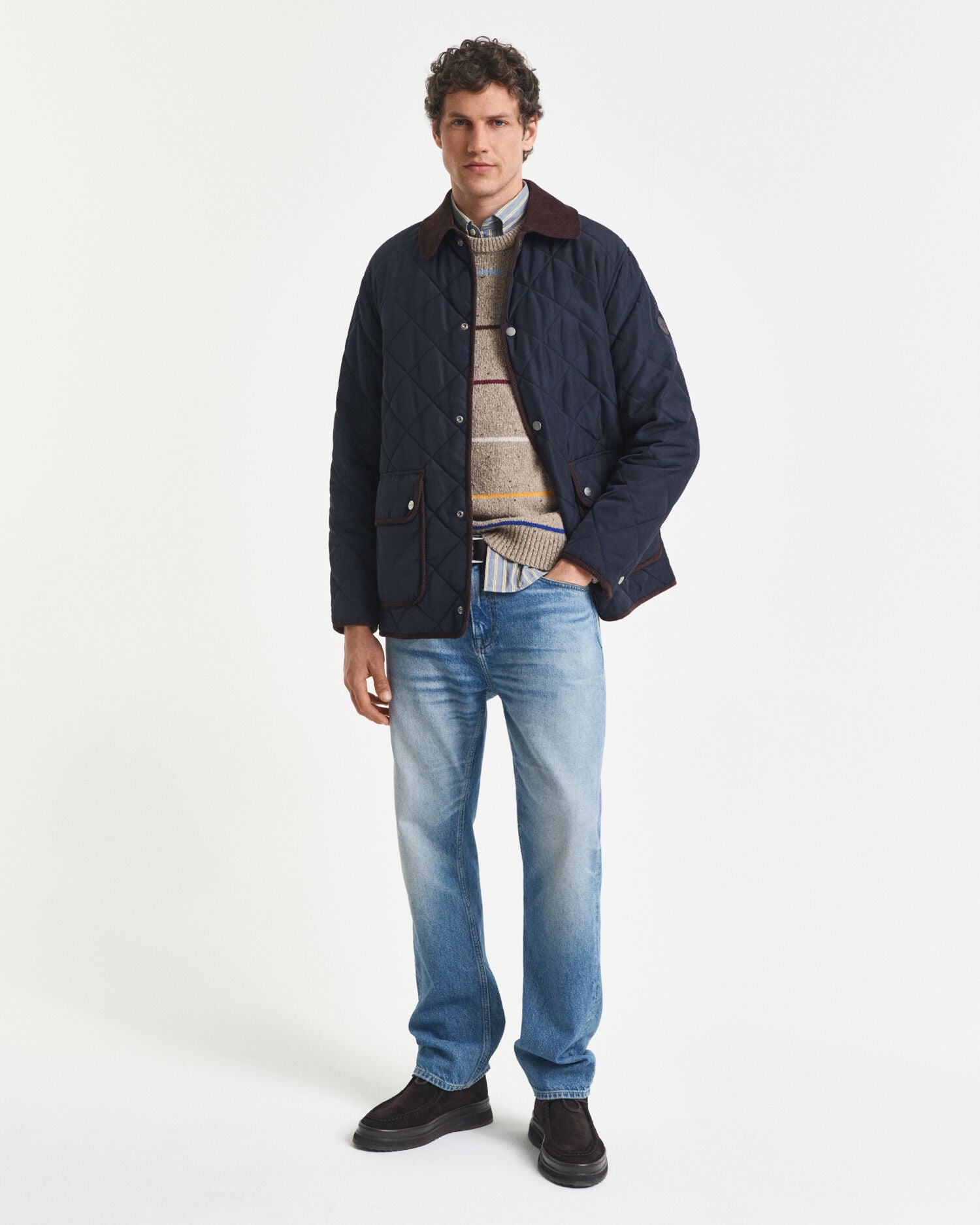 This Quilted Jacket is an essential for the colder seasons. Cut for a regular fit, it is designed with a mid-length silhouette, snap button closure and a contrast point collar. Lined with a quilted fleece interior for extra comfort, the exterior of the jacket is complete with snap button sleeve cuffs, lower patch pockets, and our signature locker loop.