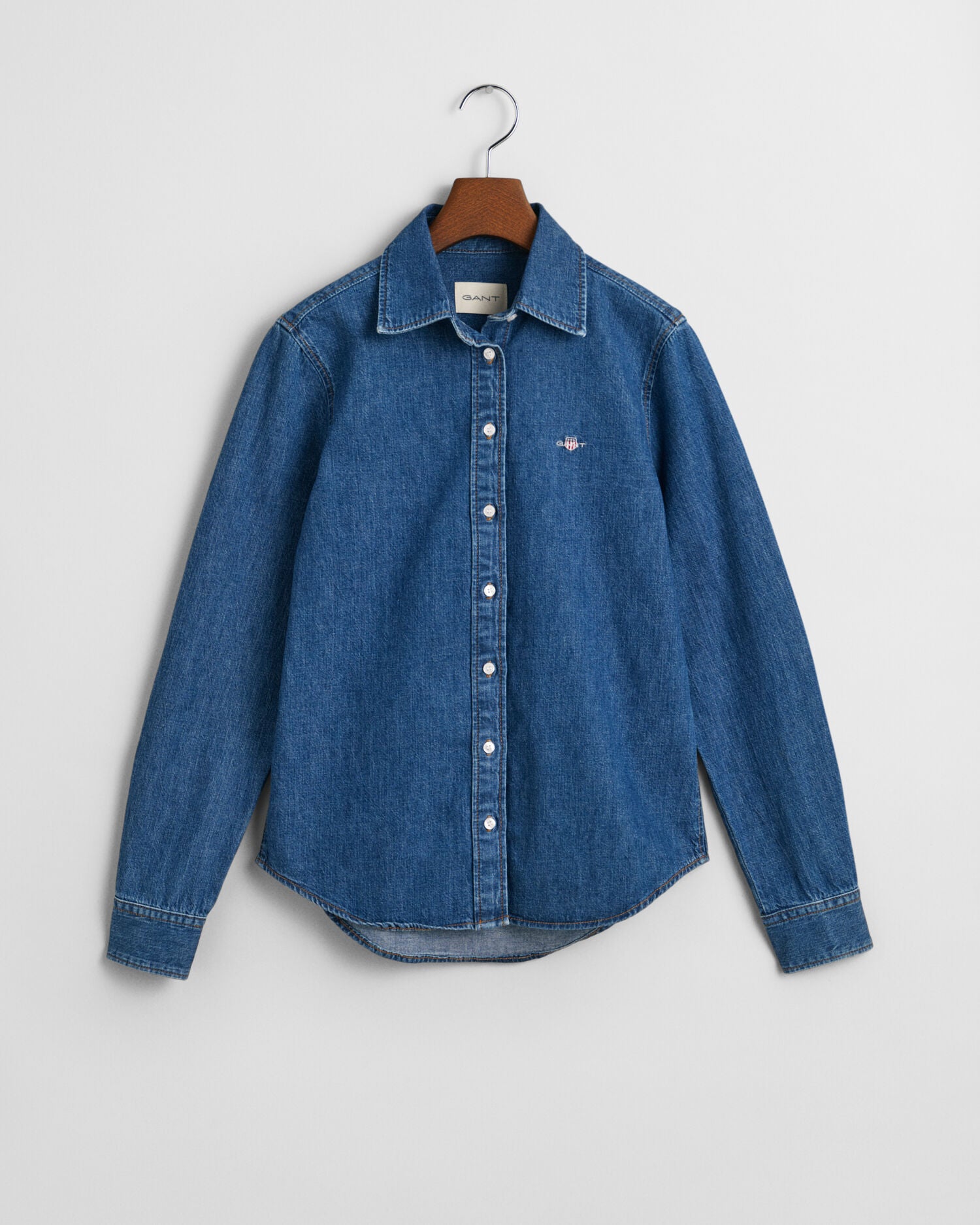 Classic in shape, this denim shirt is an elevated wardrobe basic. Crafted from washed cotton denim, it has a regular fit with long sleeves, a point collar, and a curved hem. It features our innovative box pleat with a locker loop at the back, plus a shield graphic embroidered at the chest.