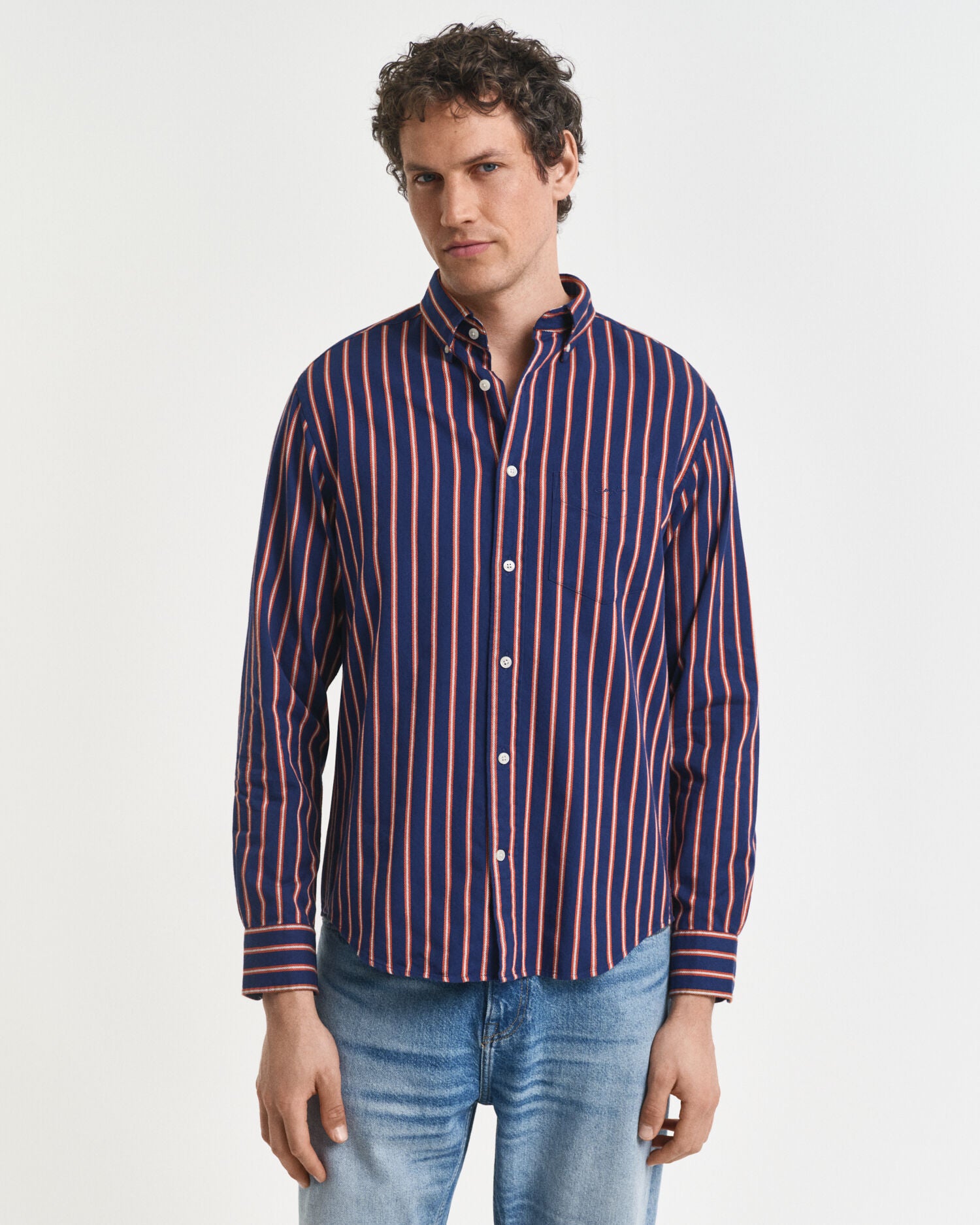 Crafted from a cotton twill fabrication, this shirt is designed with a yarn-dyed dobby stripe pattern and regular fit. The design features a classic button-down collar, adjustable cuffs, a curved hem, recycled polyester buttons and a logo embroidered at the chest pocket.