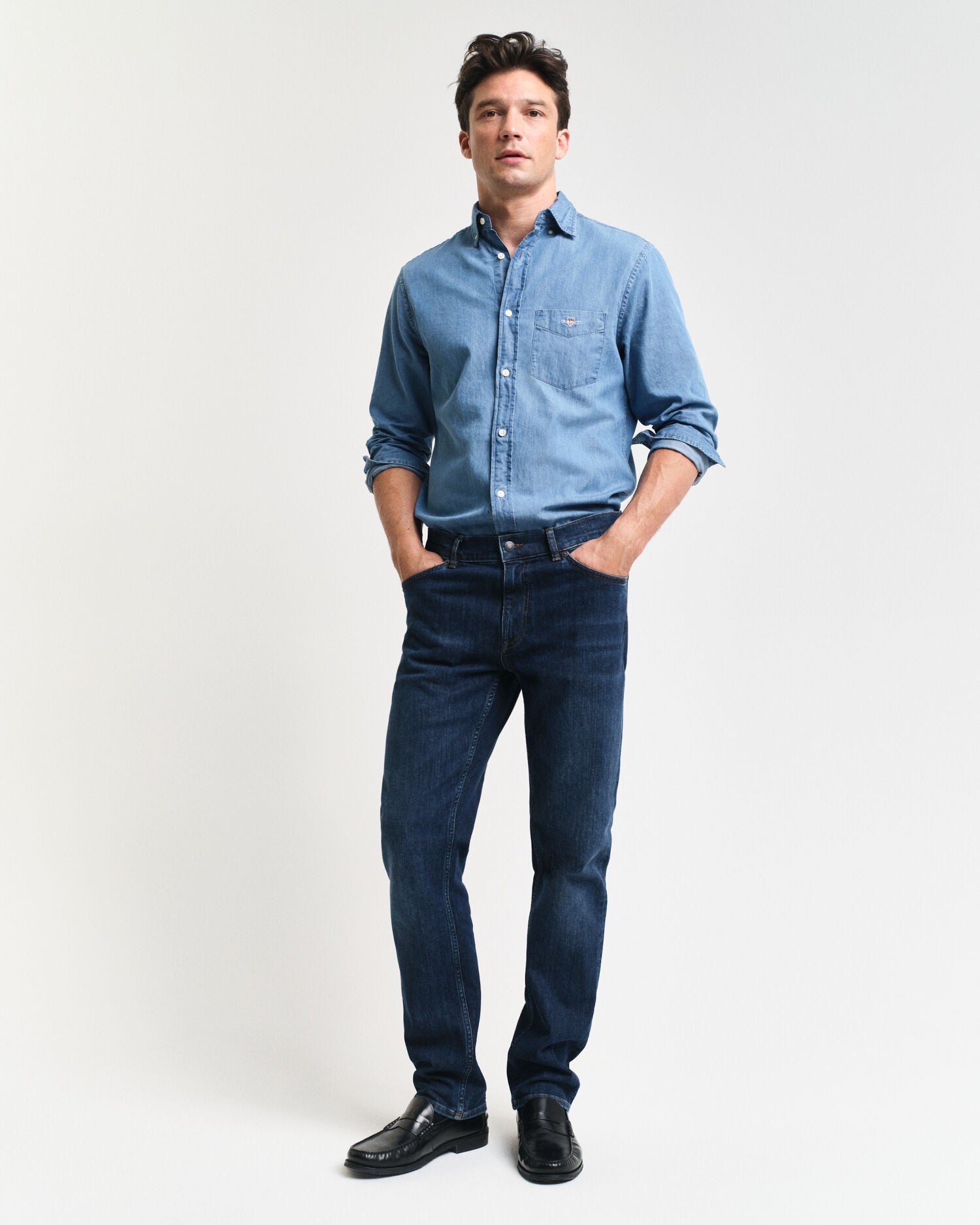 Crafted in cotton with a hint of stretch, these jeans feature a regular fit for a comfortable, classic style. A versatile wardrobe staple, these jeans are easily dressed up or down for almost any occasion.