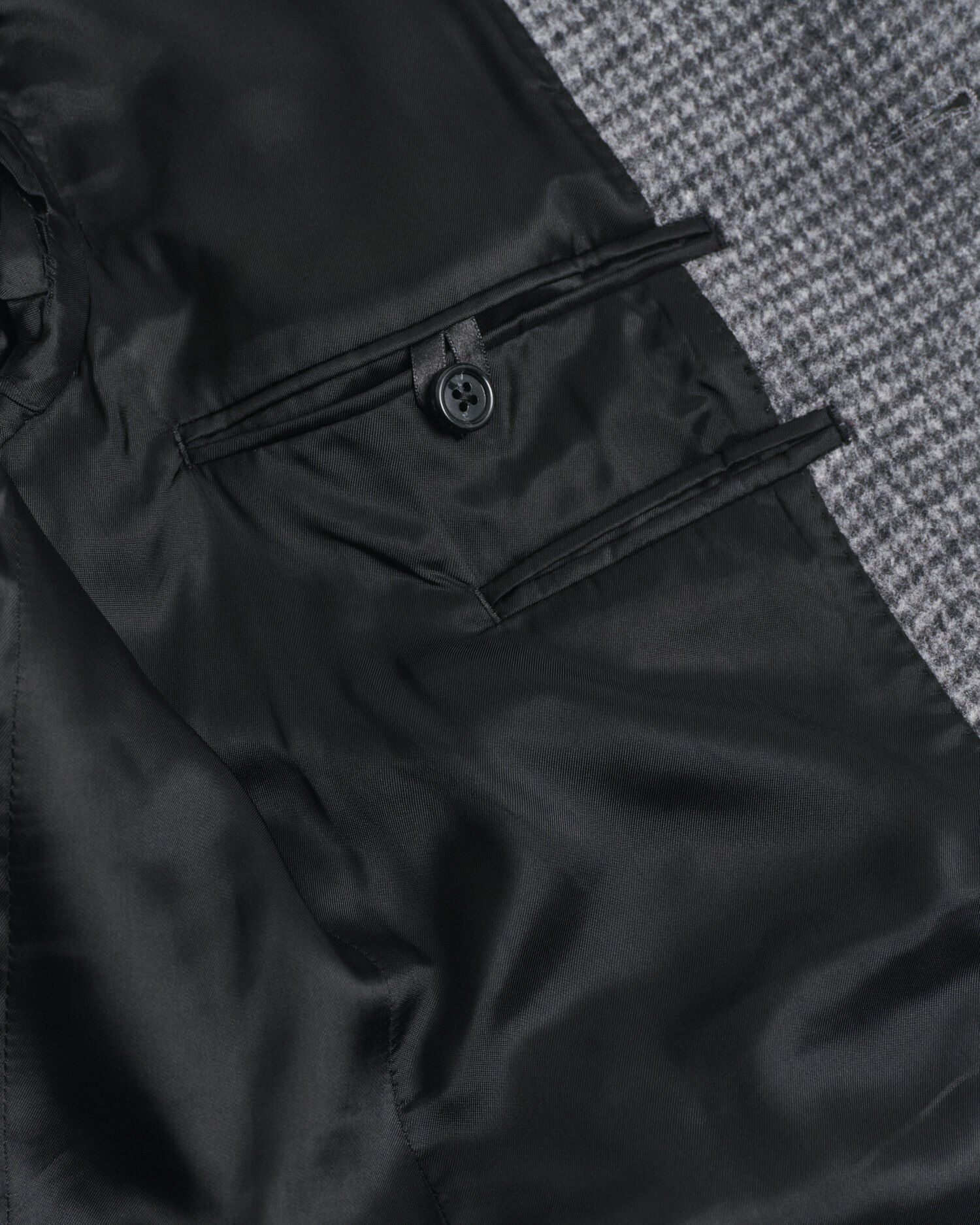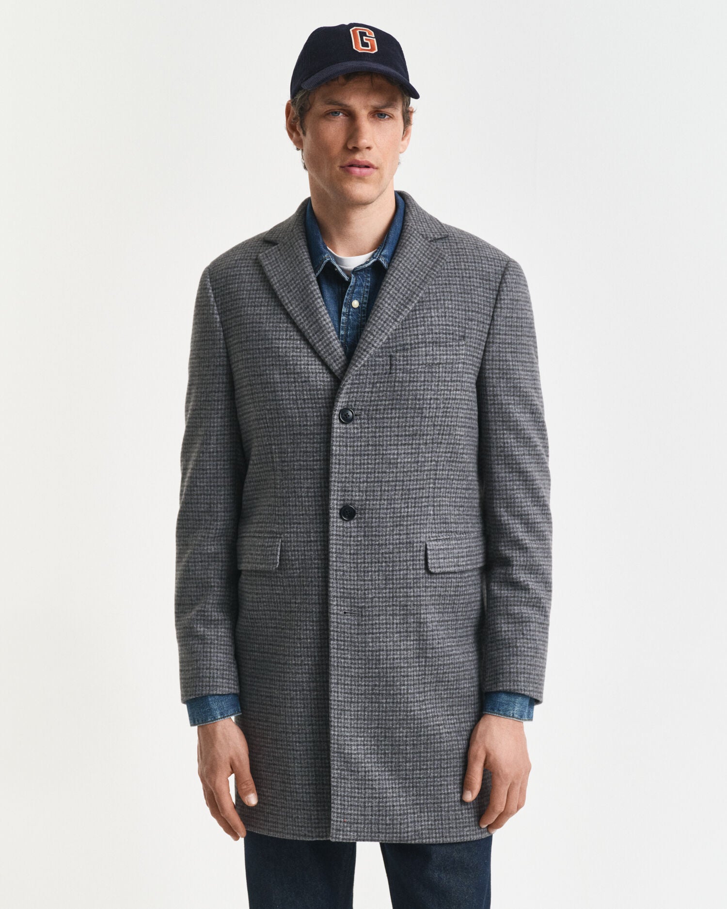 Championing a classic tailored design, this wool coat features a houndstooth pattern with a stylish two-toned effect. Double breasted and designed with notch lapels, the coat is cut for a regular fit and finishing just above the knees. The design is detailed with side flap pockets, a welt pocket at the chest and a back vent for a more fluid silhouette. The interior design is fully lined and features three pockets for additional storage.