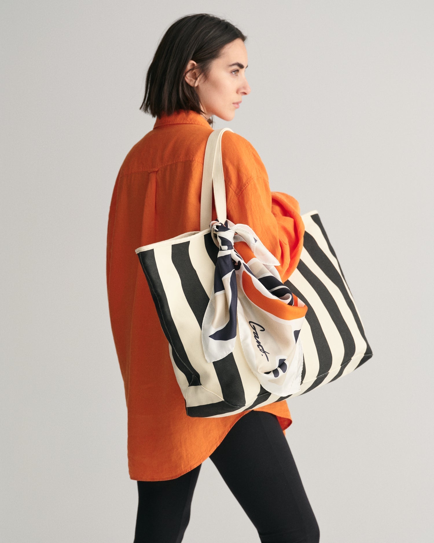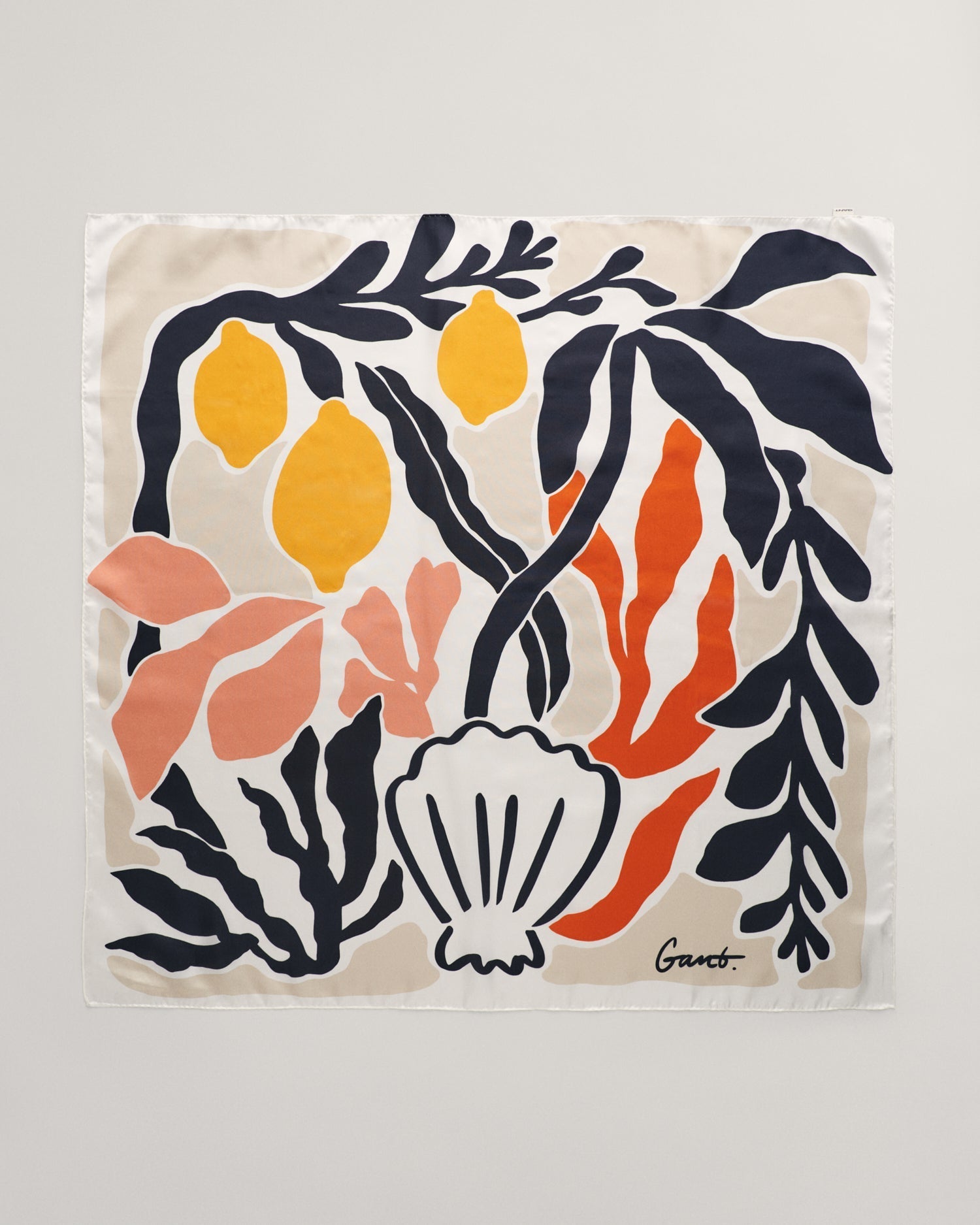 Confectionné en 100 % soie, ce foulard arbore un imprimé palmiers avec des éléments abstraits représentant des algues, un palmier et un coquillage simplifié. Apportant une touche de couleur à votre tenue, ce foulard est orné d'une signature en bas à droite.
