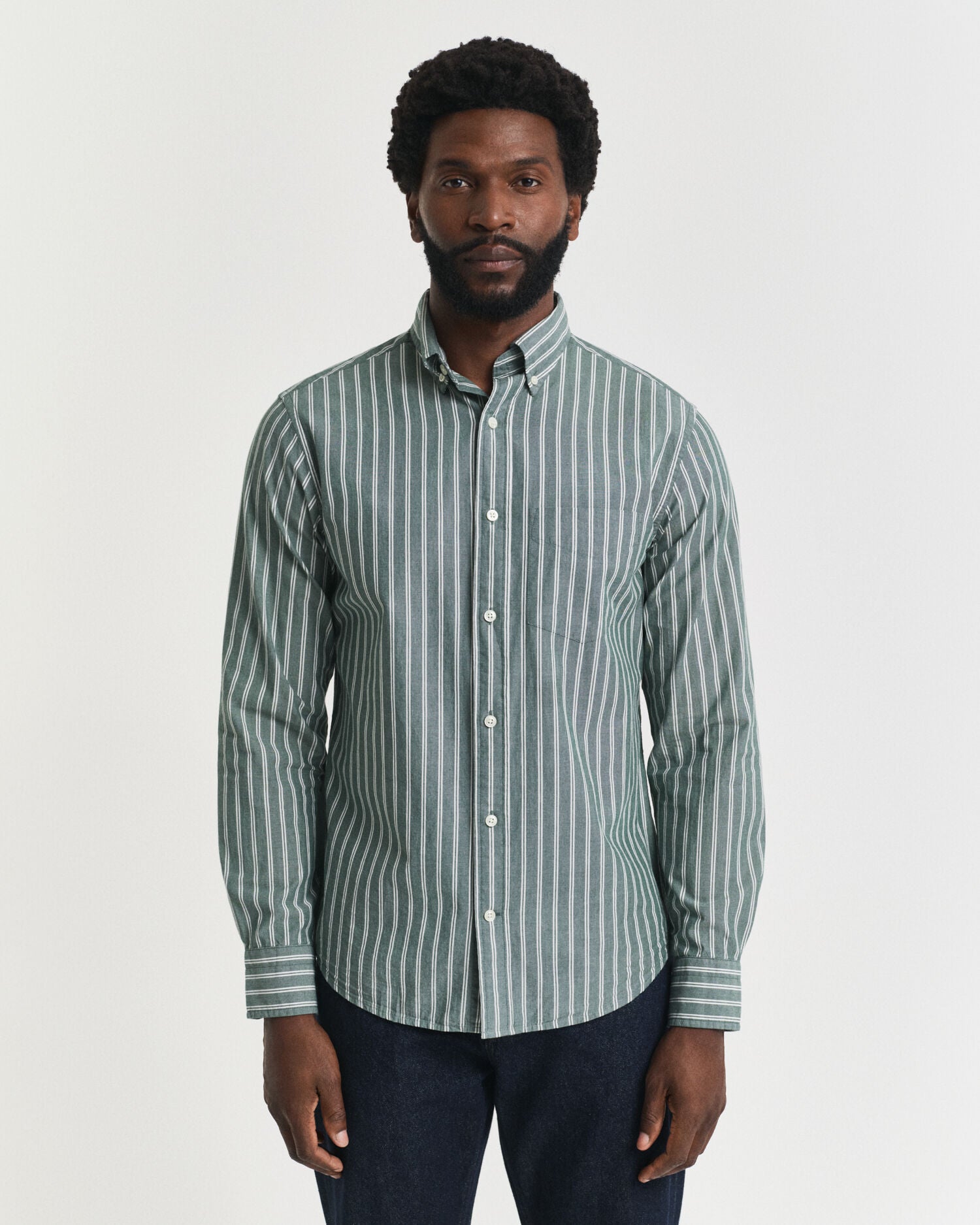 Crafted from cotton, this shirt is cut for a regular fit and features an all-over yarn dyed striped pattern inspired by our archives. Designed with a cotton poplin fabrication, the shirt is constructed with a classic button-down collar, adjustable cuffs and a curved hem. Detailed with recycled polyester buttons, the design is also embellished with a logo embroidered at the sleeve placket and a box pleat with our signature locker loop at the back.