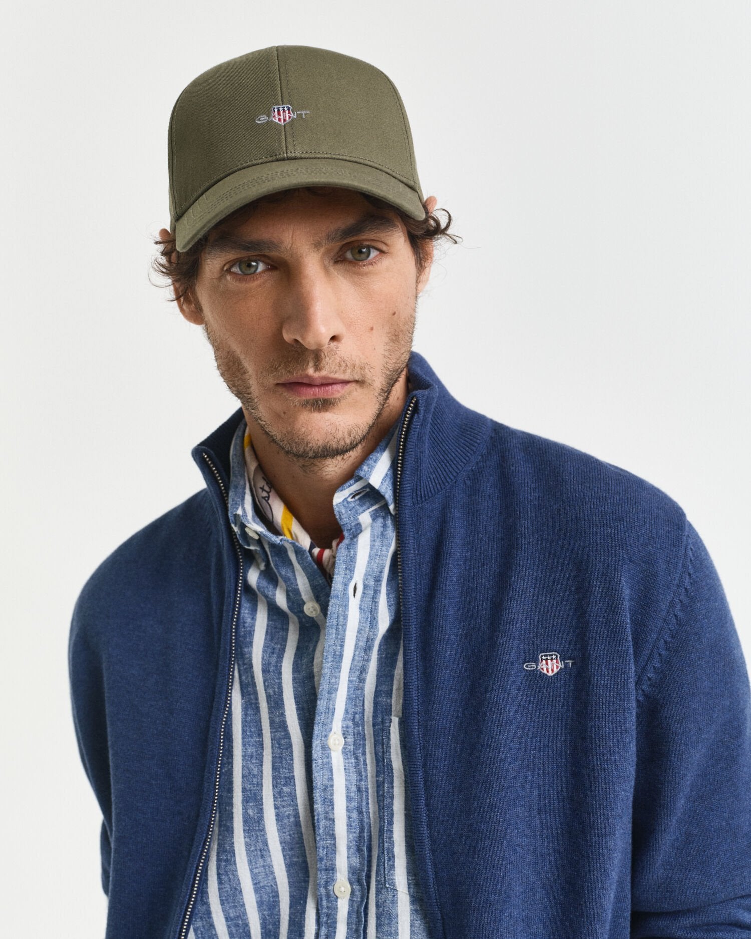 This cotton cap is crafted with a high top design, six panels and an adjustable back strap. It is detailed with a engraved metal buckle and an archive shield graphic embroidered at the front.