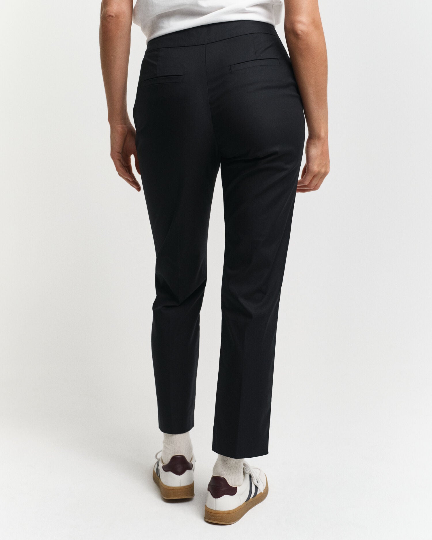 Timelessly versatile, these cigarette slacks are crafted in a cotton blend with a touch of comfort stretch. Slim over the hips, these pants have a mid-rise waist and a cropped leg. Details include front slanted pockets, back welt pockets and creases at the front and back.