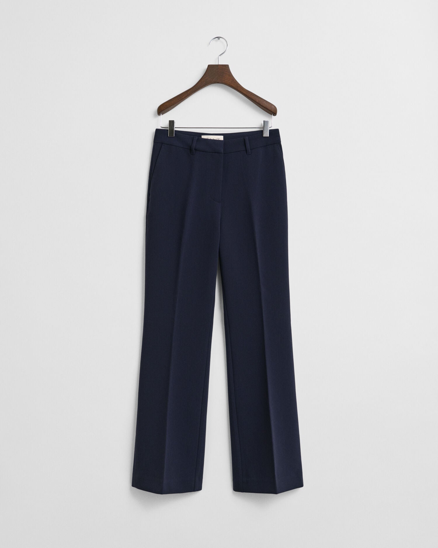Endlessly wearable, these slacks are crafted with a touch of comfort stretch. Slim over the hips, these pants have a mid-rise waist and a flared leg. Design features include front slanted pockets, back welt pockets, crease detailing and a zip closure with a hook-and-bar fix.