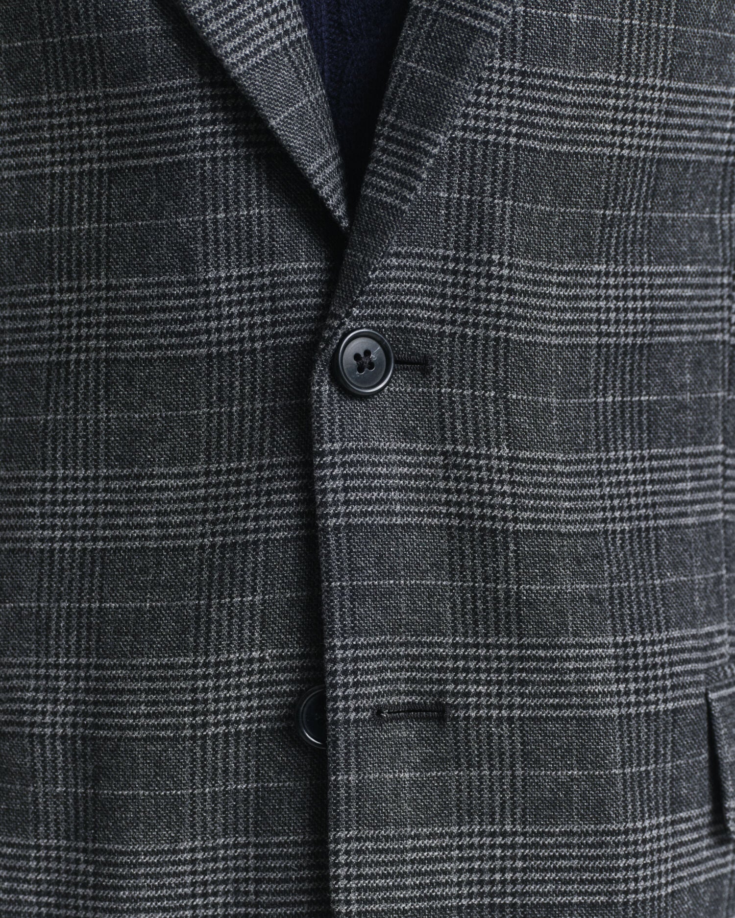 Tailored from an Italian wool blend with comfort stretch, this suit jacket is smart, versatile and built to last. Patterned with a traditional Glen Check, the fit is slim and the hem falls just below the hips. Fully lined in certified viscose, this jacket is designed for a single-breasted silouhette with a two-button closure. Other design elements include a notch collar and lapels, felt under the collar, a chest welt pocket, lower jet pockets and three interior pockets. This jacket is also detailed with back vents, branded imitation horn buttons and a removable description label at the sleeve. Style with the matching suit pants for a standout, suited look.