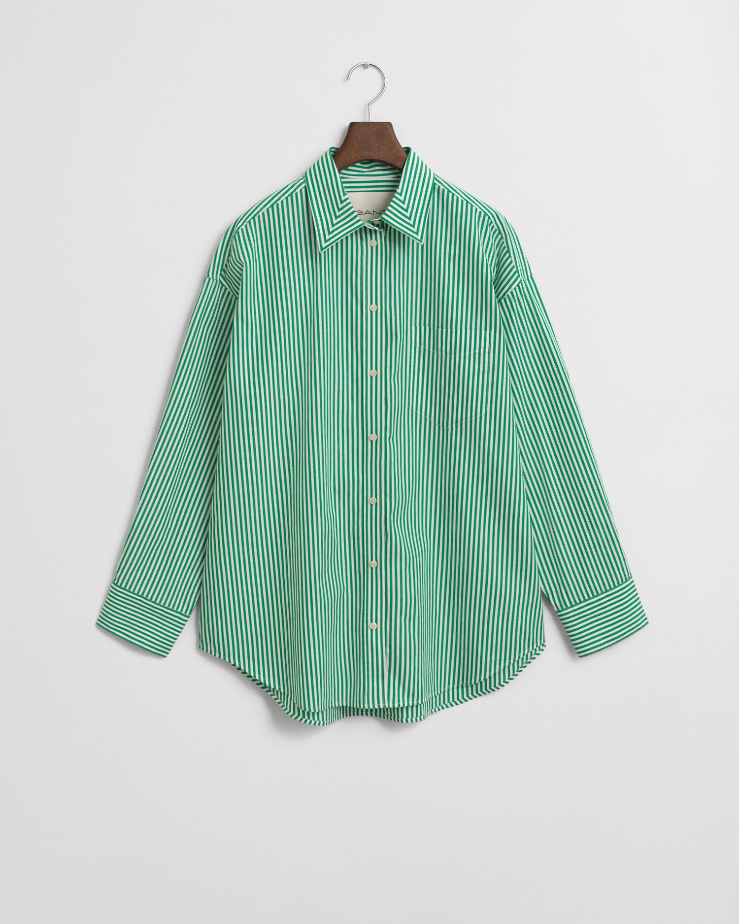 Crafted in certified cotton poplin, this shirt is patterned with an all-over striped print. Delivering an oversized silhouette, it features a cut-line detail on the collar, a curved hem, chest pocket and a subtle logo embroidered at the sleeve placket. This garment is intended for an oversized fit. For a closer fit, we recommend sizing down.